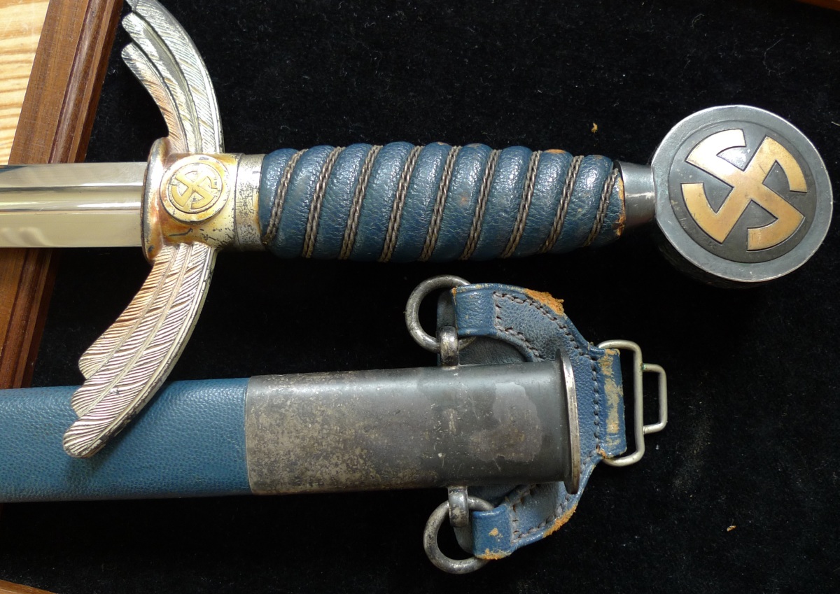 This is my second early nickle silver Luftwaffe sword, this one has very nice leather to the handle and scarab and decent amount of silver finish left.
